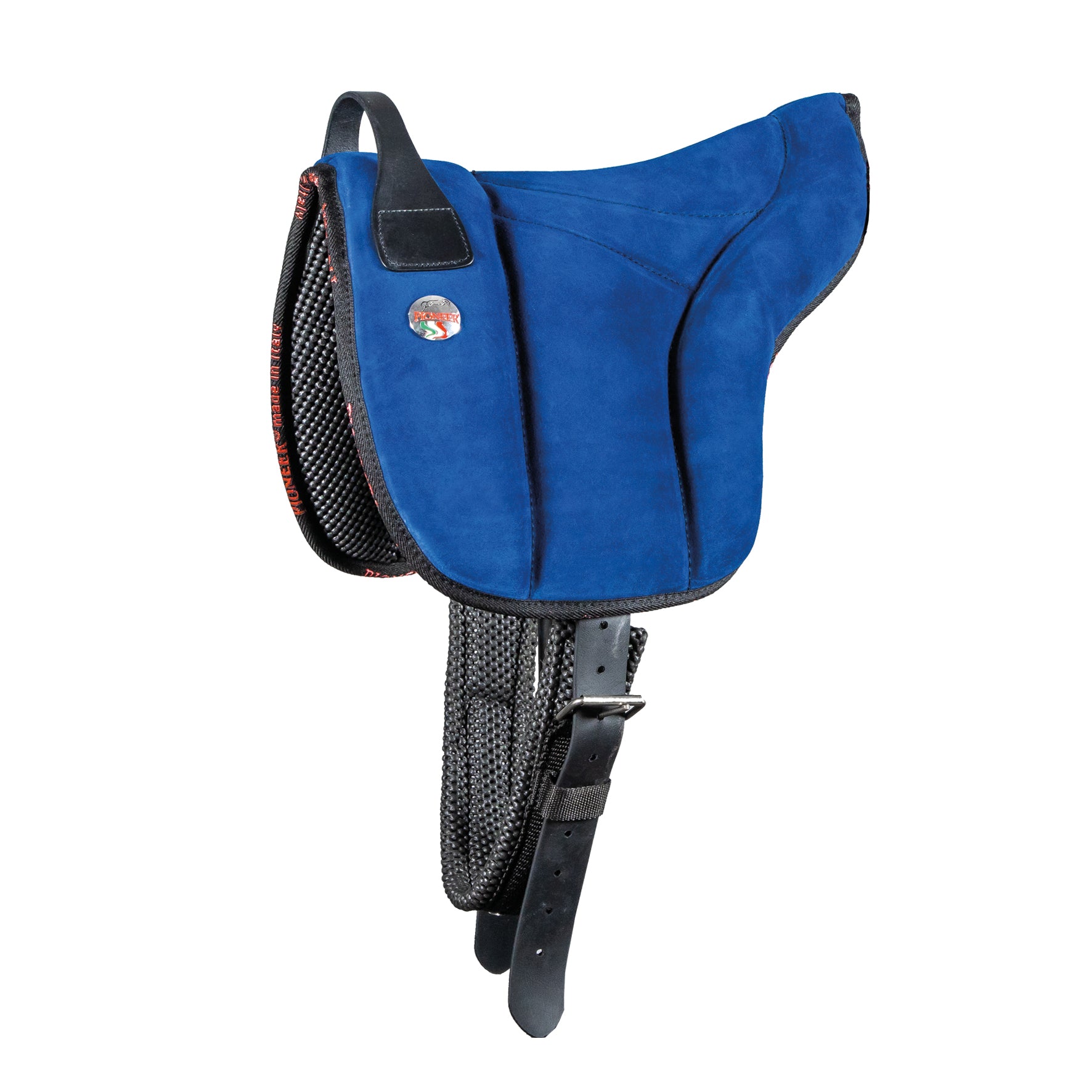 Bareback in pelle scamosciata con imbottitura in ovatta e memory foam, maniglia in cuoio. Riscontri in biothane,completo di sottopancia.